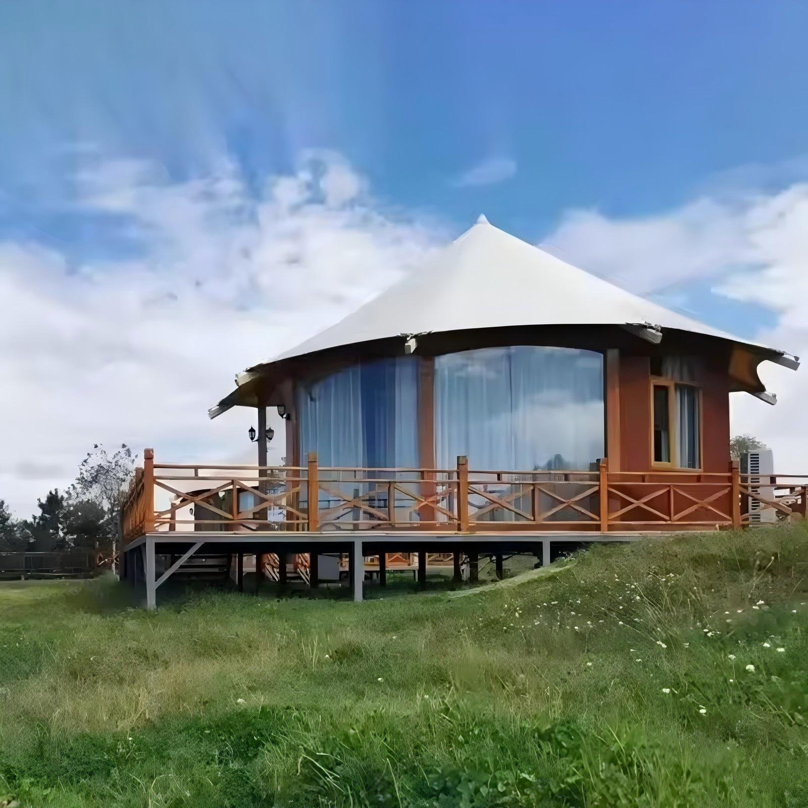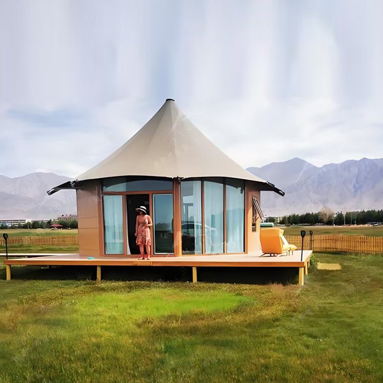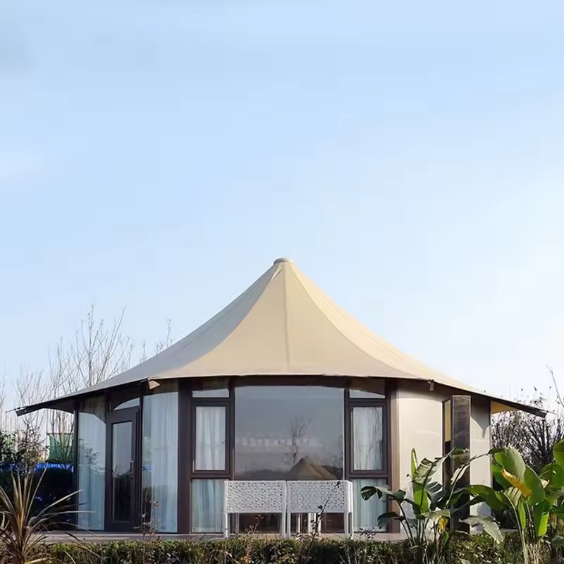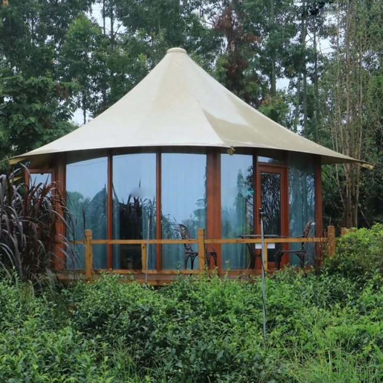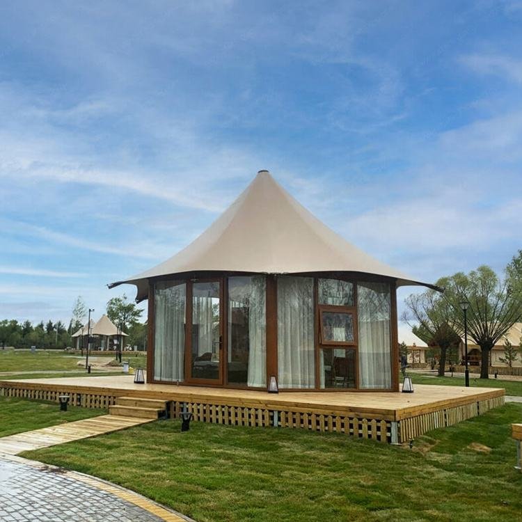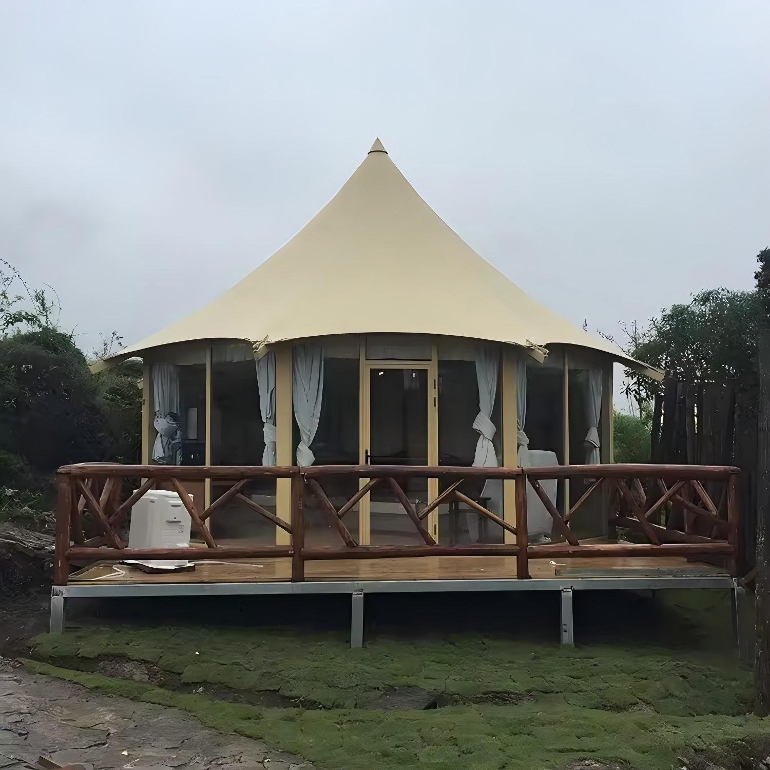 Customized High End Prefab House Hotel Tent Single-Peak Roof Glamping Tent with Tempered Glass Wall PVC Safari Camping Tents