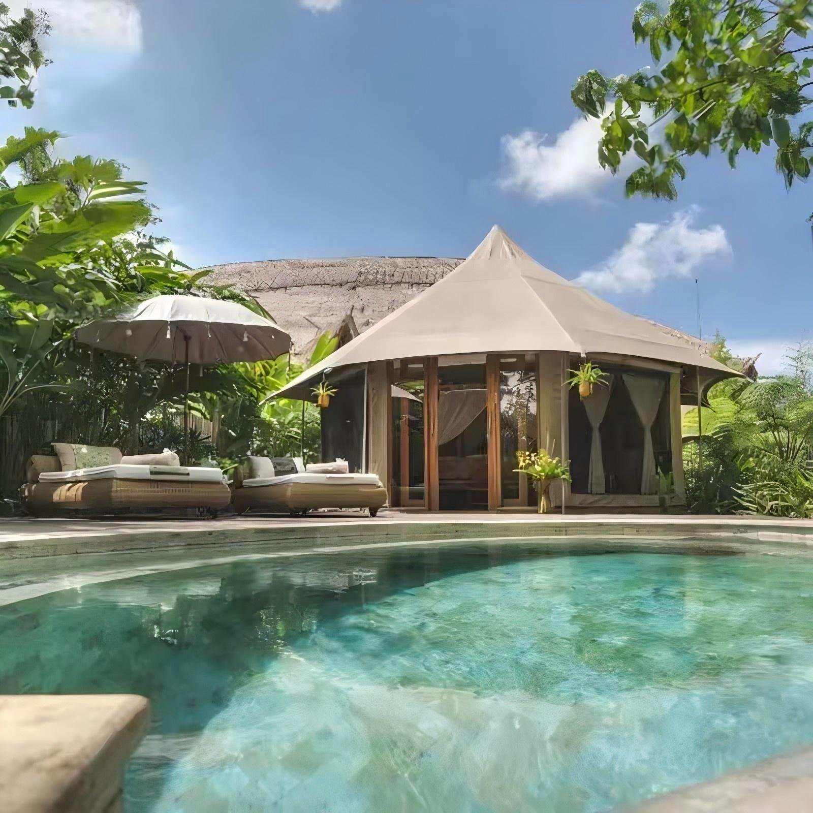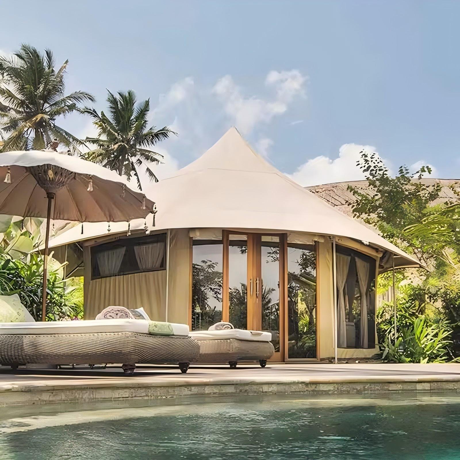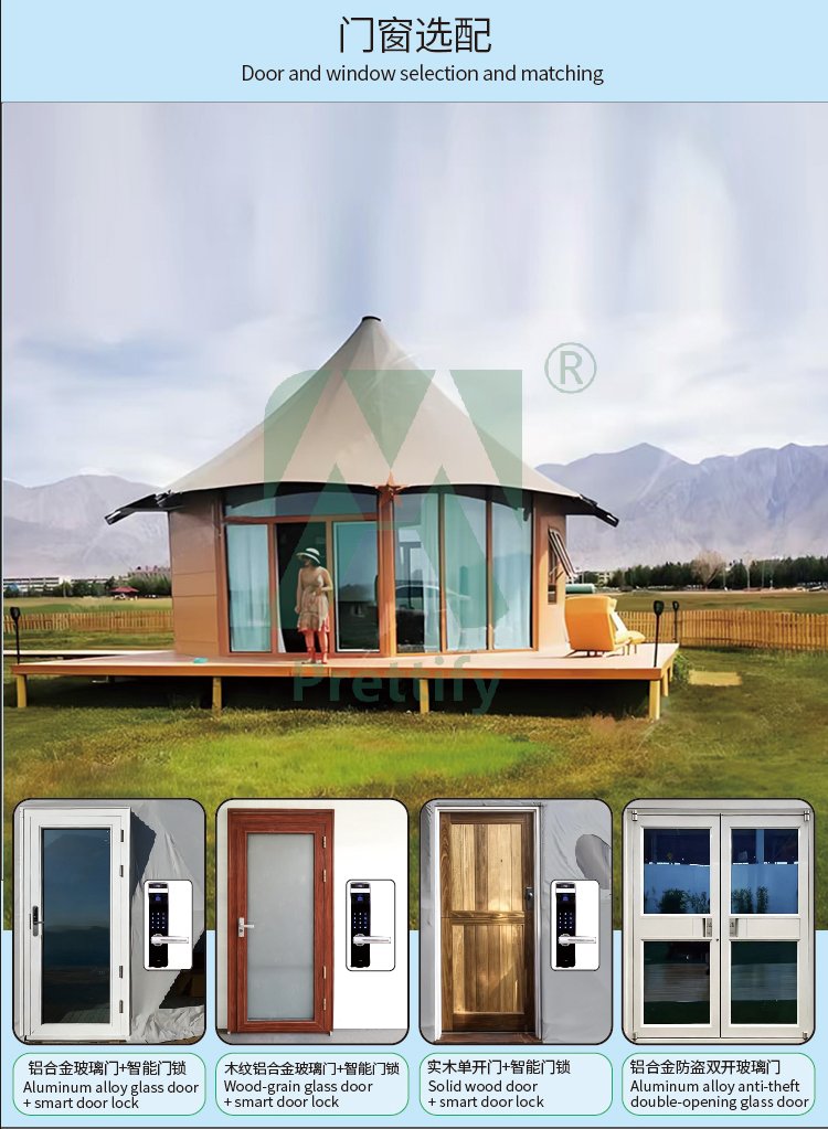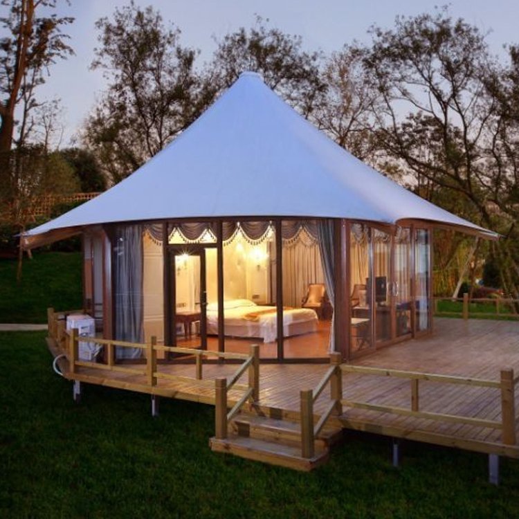 Customized High End Prefab House Hotel Tent Single-Peak Roof Glamping Tent with Tempered Glass Wall PVC Safari Camping Tents